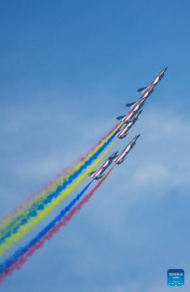 Aircraft of the Bayi Aerobatic Team of the Chinese People's Liberation Army Air Force perform during the 2025 aviation open-day activities of the Chinese People's Liberation Army Air Force and Changchun Air Show in Changchun, northeast China's Jilin Province, Sept. 19, 2025. The events kicked off here on Friday. [Xinhua/Zhang Nan]