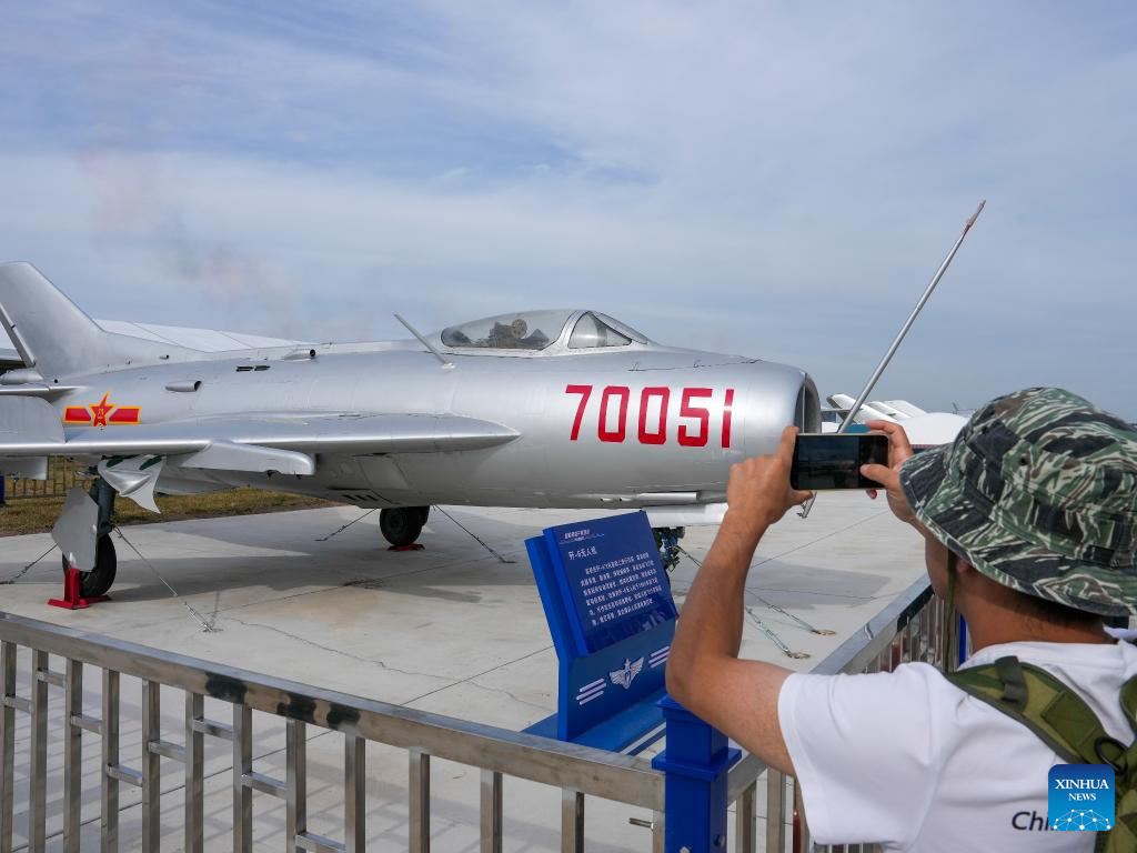 A man takes photos of a modified pilotless J-6 aircraft during the 2025 aviation open-day activities of the Chinese People's Liberation Army Air Force and Changchun Air Show in Changchun, northeast China's Jilin Province, Sept. 19, 2025. The events kicked off here on Friday. [Xinhua/Zhang Nan]