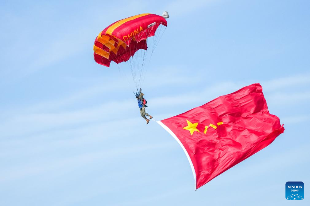 A member of the Bayi Parachute Team of the Chinese People's Liberation Army Air Force performs during the 2025 aviation open-day activities of the Chinese People's Liberation Army Air Force and Changchun Air Show in Changchun, northeast China's Jilin Province, Sept. 19, 2025. The events kicked off here on Friday. [Xinhua/Yan Linyun]
