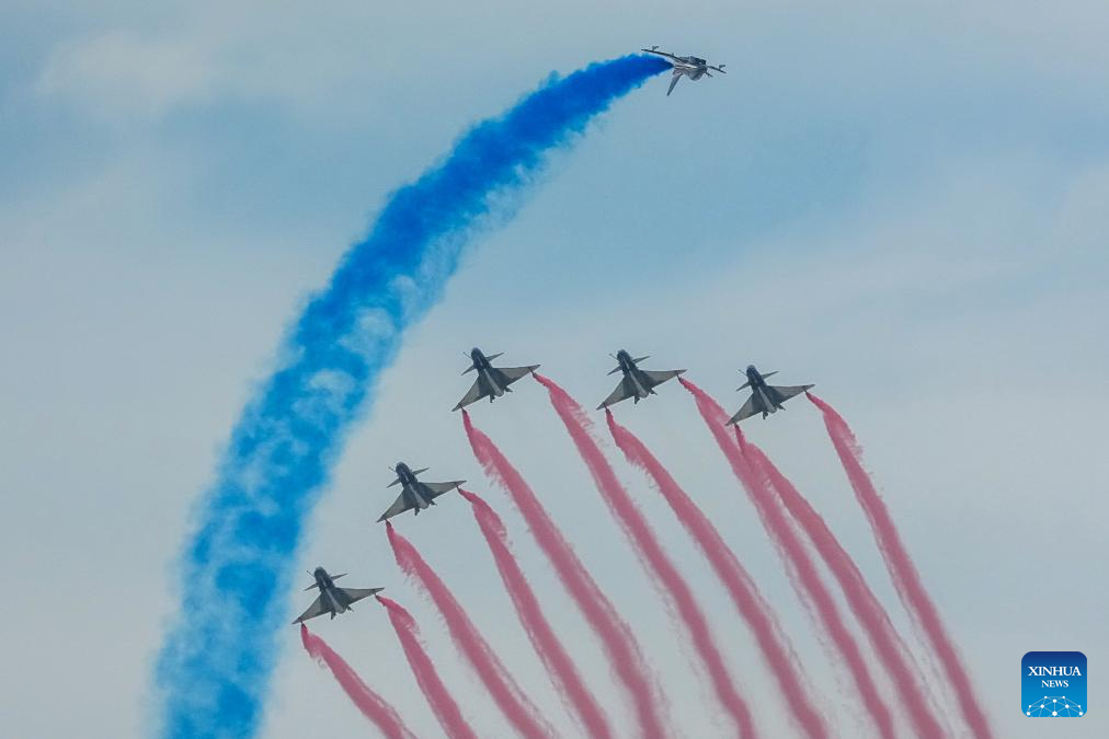 Aircraft of the Bayi Aerobatic Team of the Chinese People's Liberation Army Air Force perform during the 2025 aviation open-day activities of the Chinese People's Liberation Army Air Force and Changchun Air Show in Changchun, northeast China's Jilin Province, Sept. 19, 2025. The events kicked off here on Friday. [Xinhua/Zhang Nan]