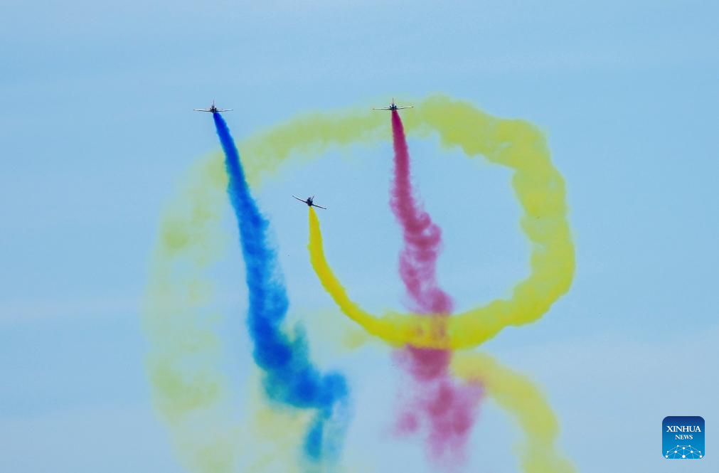 Aircraft of China's Red Falcon Aerobatic Team perform during the 2025 aviation open-day activities of the Chinese People's Liberation Army Air Force and Changchun Air Show in Changchun, northeast China's Jilin Province, Sept. 19, 2025. The events kicked off here on Friday. [Xinhua/Yan Linyun]