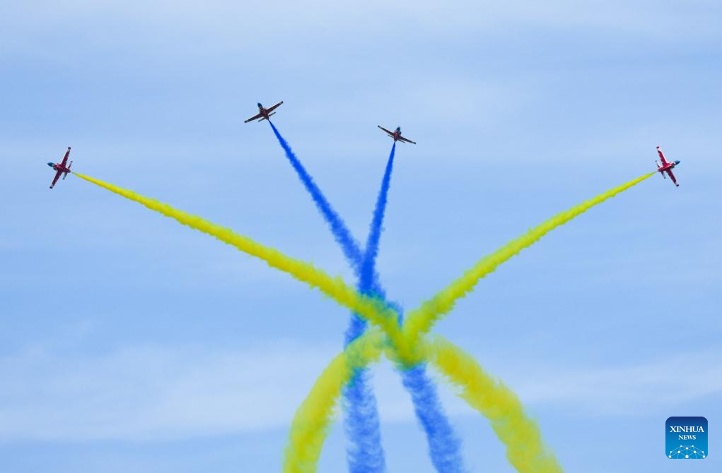 Aircraft of China's Red Falcon Aerobatic Team perform during the 2025 aviation open-day activities of the Chinese People's Liberation Army Air Force and Changchun Air Show in Changchun, northeast China's Jilin Province, Sept. 19, 2025. The events kicked off here on Friday. [Xinhua/Yan Linyun]