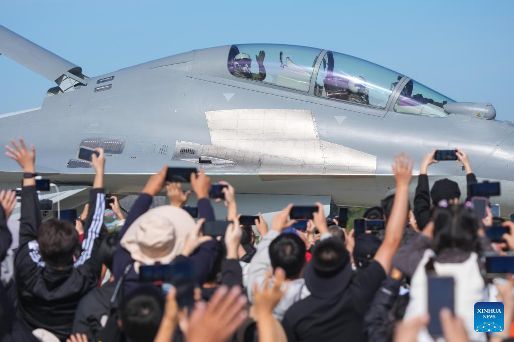 Pilots of a J-16 fighter jet greet the audience during the 2025 aviation open-day activities of the Chinese People's Liberation Army Air Force and Changchun Air Show in Changchun, northeast China's Jilin Province, Sept. 19, 2025. The events kicked off here on Friday. [Xinhua/Xu Chang]