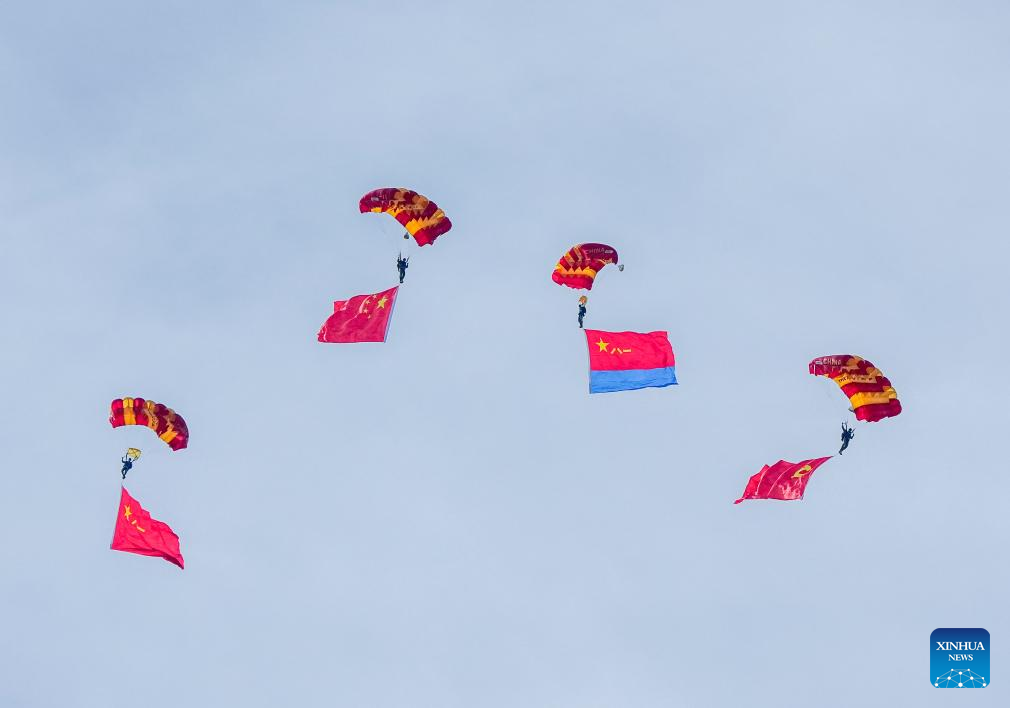 Members of the Bayi Parachute Team of the Chinese People's Liberation Army Air Force perform during the 2025 aviation open-day activities of the Chinese People's Liberation Army Air Force and Changchun Air Show in Changchun, northeast China's Jilin Province, Sept. 19, 2025. The events kicked off here on Friday. (Xinhua/Yan Linyun)
