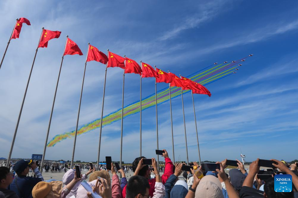 Aircraft of China's Red Falcon Aerobatic Team perform during the 2025 aviation open-day activities of the Chinese People's Liberation Army Air Force and Changchun Air Show in Changchun, northeast China's Jilin Province, Sept. 19, 2025. The events kicked off here on Friday. [Xinhua/Xu Chang]