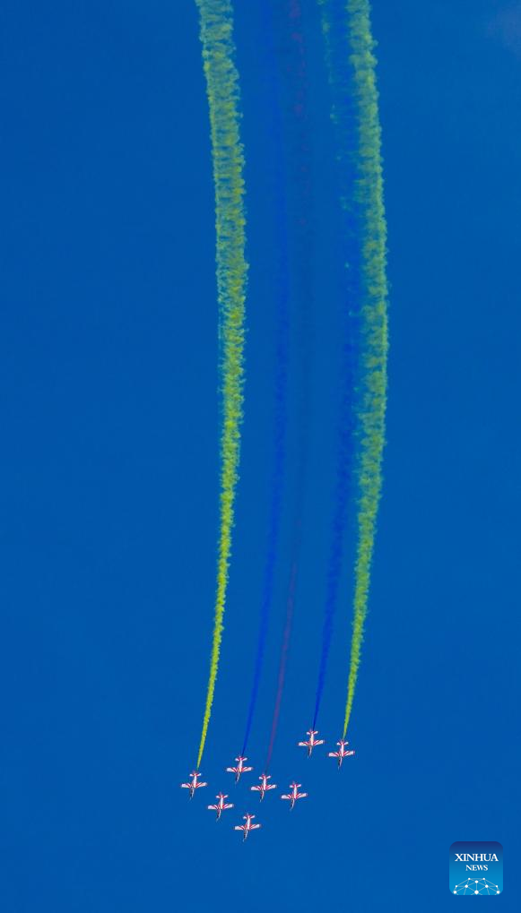 Aircraft of China's Red Falcon Aerobatic Team perform during the 2025 aviation open-day activities of the Chinese People's Liberation Army Air Force and Changchun Air Show in Changchun, northeast China's Jilin Province, Sept. 19, 2025. The events kicked off here on Friday. [Xinhua/Yan Linyun]