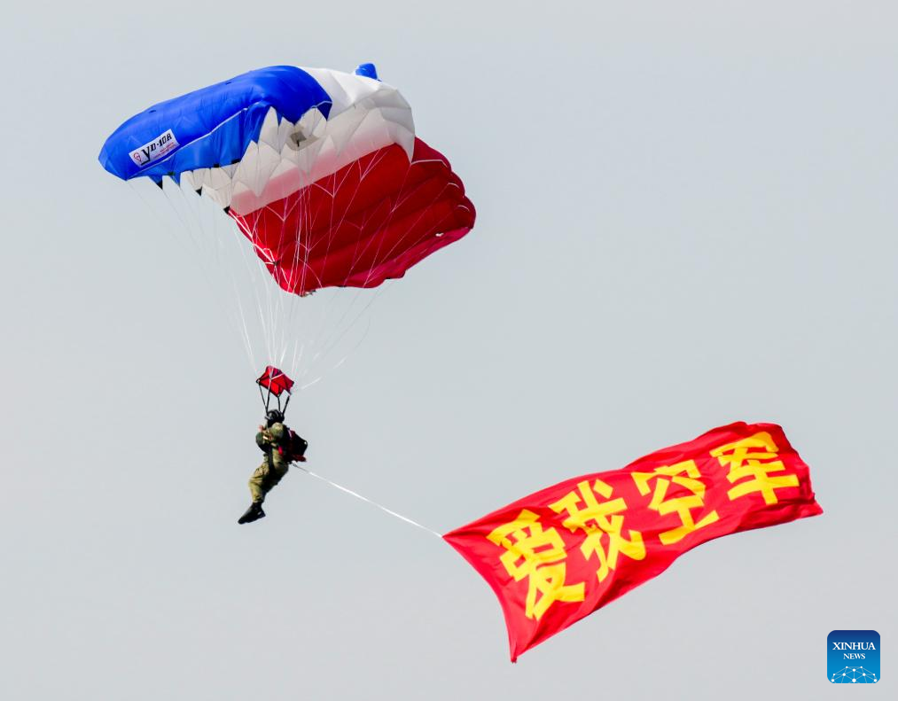 A member of the Blue Eagle Parachute Team performs during the 2025 aviation open-day activities of the Chinese People's Liberation Army Air Force and Changchun Air Show in Changchun, northeast China's Jilin Province, Sept. 19, 2025. The events kicked off here on Friday. [Xinhua/Zhang Nan]