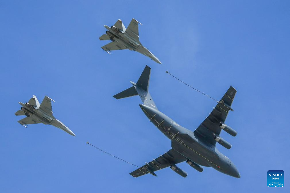 A YY-20A tanker aircraft and two J-16 fighter jets are pictured during the 2025 aviation open-day activities of the Chinese People's Liberation Army Air Force and Changchun Air Show in Changchun, northeast China's Jilin Province, Sept. 19, 2025. The events kicked off here on Friday. [Xinhua/Yan Linyun]