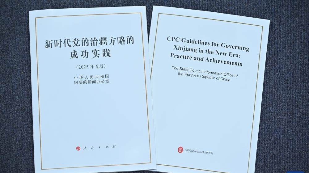 This photo taken on Sept. 19, 2025 shows copies of the white paper titled "CPC Guidelines for Governing Xinjiang in the New Era: Practice and Achievements" released by the State Council Information Office (SCIO). [Xinhua/Li Xin]