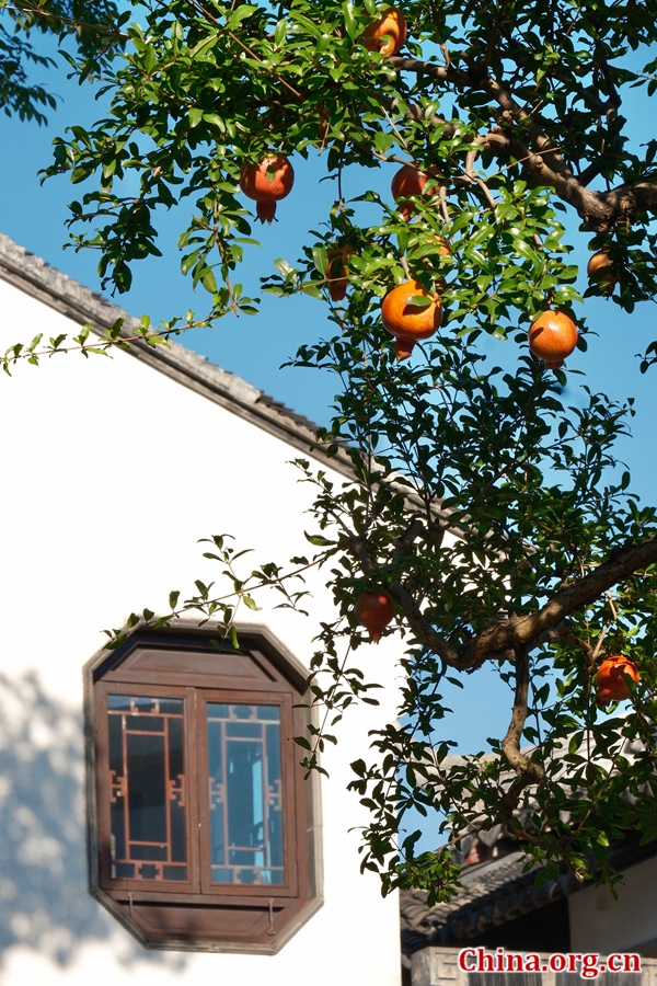 Ripe pomegranates hang beside a traditional Suzhou-style building at Yi Garden, east China's Jiangsu province, Aug. 27, 2025. [Photo/China.org.cn]