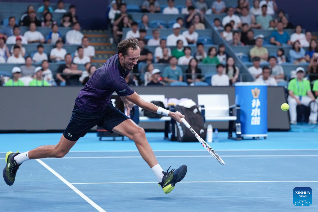 Daniil Medvedev of Russia hits a return during the quarterfinal tennis match between Daniil Medvedev of Russia and Wu Yibing of China at ATP 2025 Hangzhou Open in Hangzhou, east China's Zhejiang Province, on Sept. 21, 2025. (Xinhua/Huang Zongzhi)
