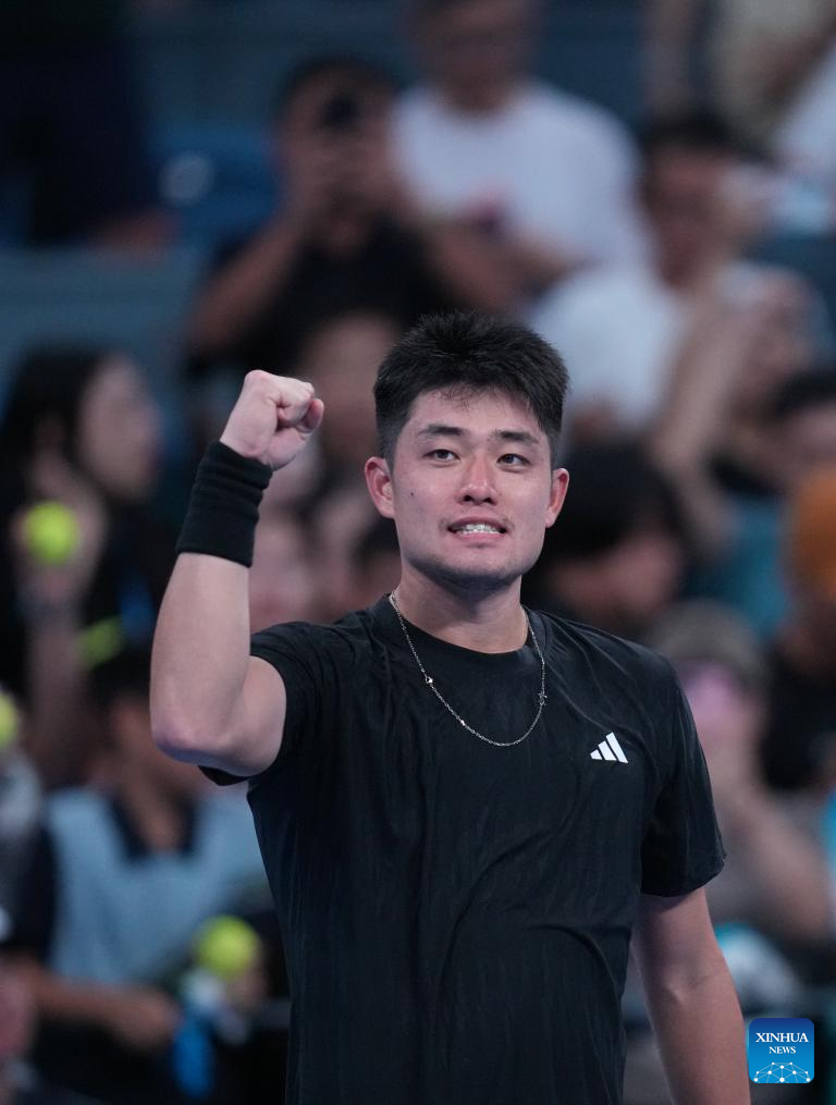 Wu Yibing of China celebrates after winning the quarterfinal tennis match between Daniil Medvedev of Russia and Wu Yibing of China at ATP 2025 Hangzhou Open in Hangzhou, east China's Zhejiang Province, on Sept. 21, 2025. (Xinhua/Huang Zongzhi)