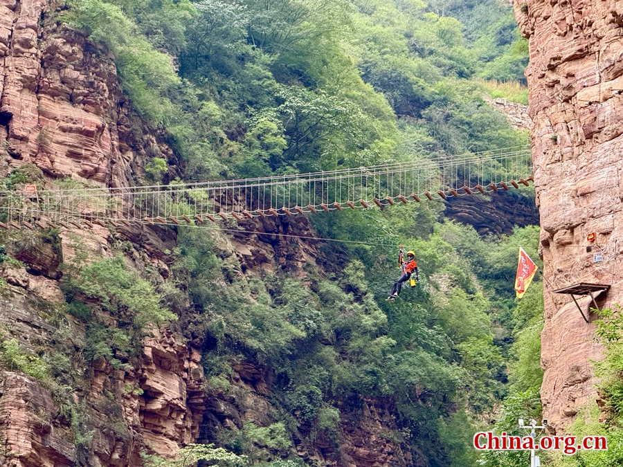 The visitor enjoys zip line ride at Xingtai Grand Canyon, Xindu district, Xingtai, Hebei province, Sept. 15, 2025. [Photo by Chen Xinyan/China.org.cn]