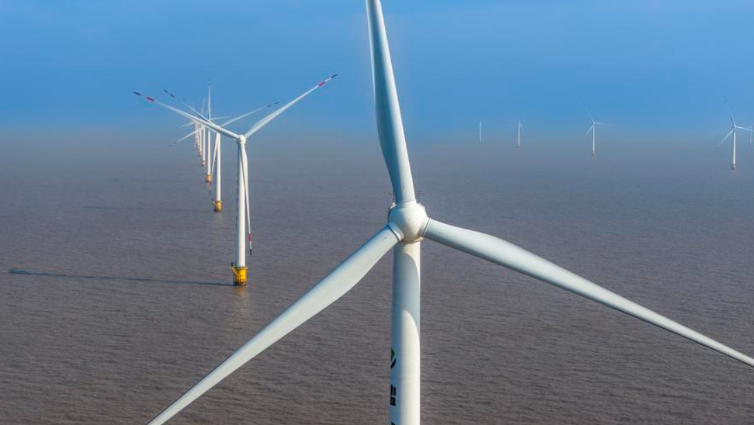 An aerial drone photo taken on Jan. 11, 2025 shows an offshore wind farm near the coast of Yancheng, east China's Jiangsu Province. [Photo/Xinhua]