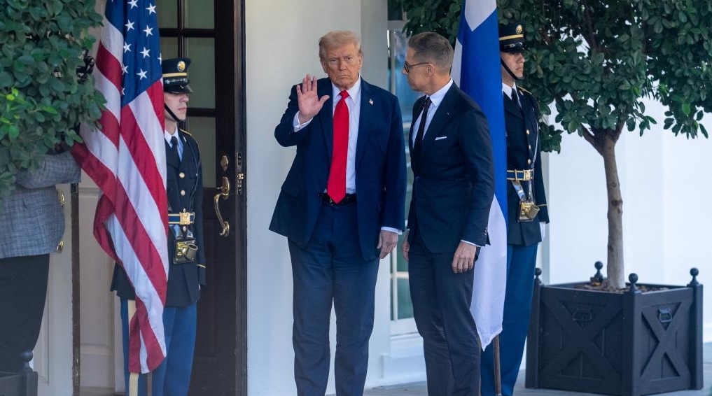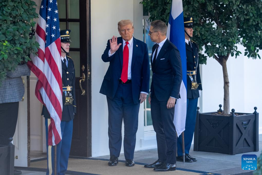 U.S. President Donald Trump (2nd L) welcomes Finnish President Alexander Stubb (2nd R) at the White House in Washington, D.C., the United States, Oct 9, 2025. (Xinhua/Hu Yousong)