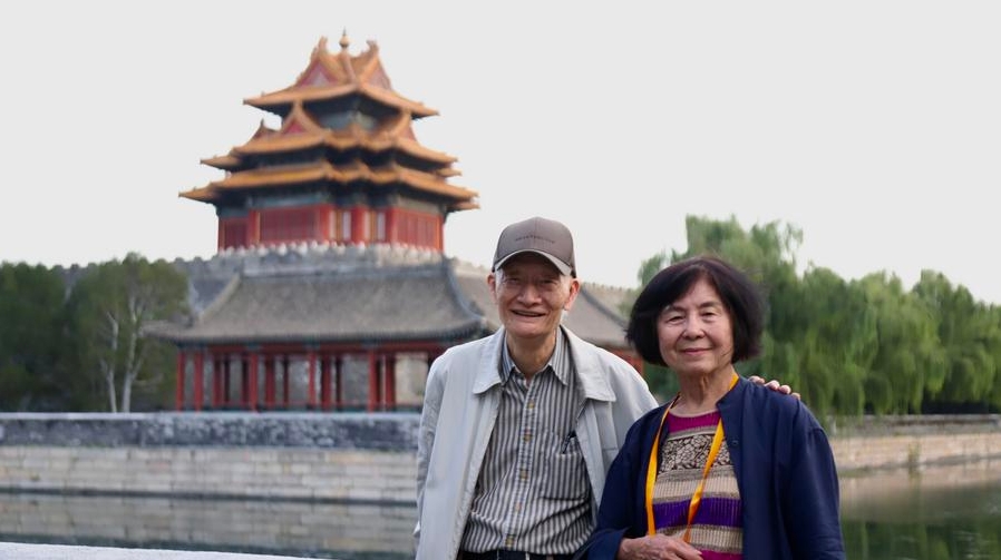 Chuang Ling, the son of Chuang Yan, former vice curator of the Palace Museum in Taipei, poses for a photo with his wife while visiting Beijing for an exhibition commemorating the miraculous evacuation of the Palace Museum's collection during Chinese People's War of Resistance against Japanese Aggression more than 80 years ago, in Beijing, capital of China, Sept. 30, 2025. [Photo/Xinhua]