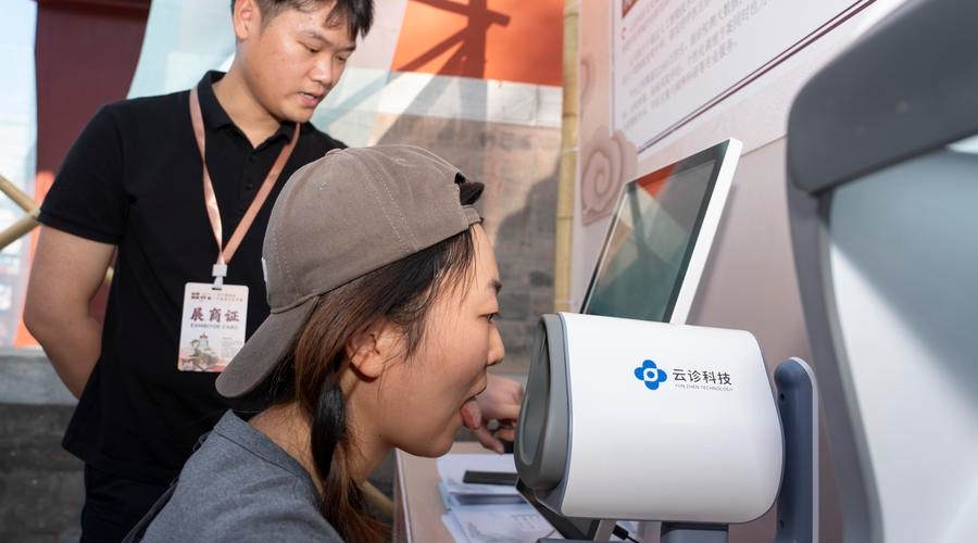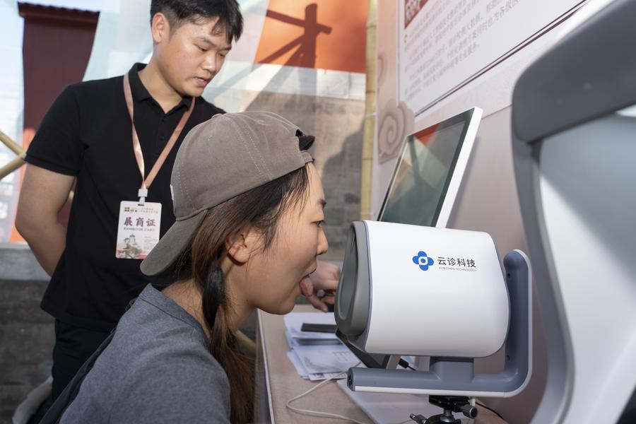 A visitor has her tongue checked by a medical examination device at the booth of the Anhui University of Traditional Chinese Medicine at a fair themed on traditional Chinese medicine (TCM) and culture in Xicheng District of Beijing, capital of China, Sept. 19, 2025. [Photo/Xinhua]