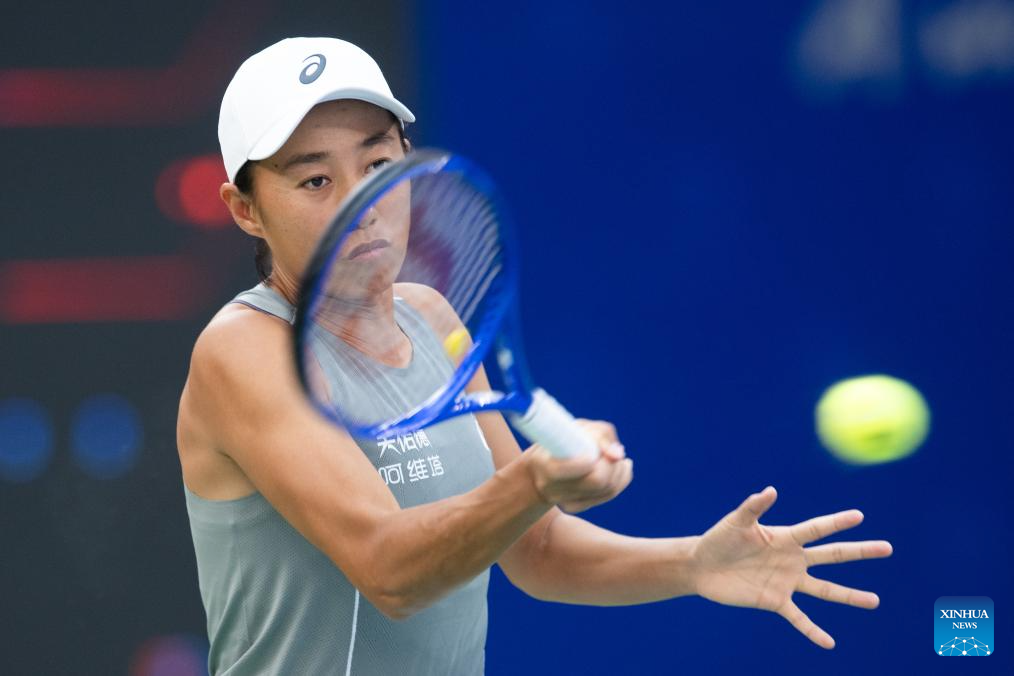 Zhang Shuai of China hits a return during the women's singles round of 64 match against Emma Navarro of the United States at the 2025 Wuhan Open tennis tournament in Wuhan, central China's Hubei Province, Oct. 7, 2025. (Xinhua/Xiao Yijiu)