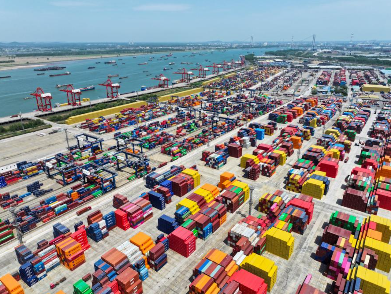This aerial drone photo shows a view of the container terminal of Nanjing Port in east China's Jiangsu Province, April 16, 2025. (Photo by Fang Dongxu/Xinhua)
