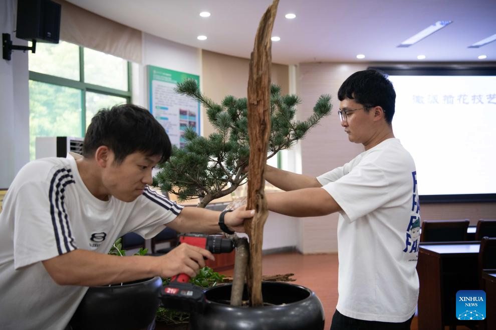 Fu Yulan's team members create flower arrangement artworks at the School of Forestry and Landscape Architecture of the Anhui Agricultural University in Hefei, east China's Anhui Province, Sept. 29, 2025. [Xinhua/Zhang Duan]