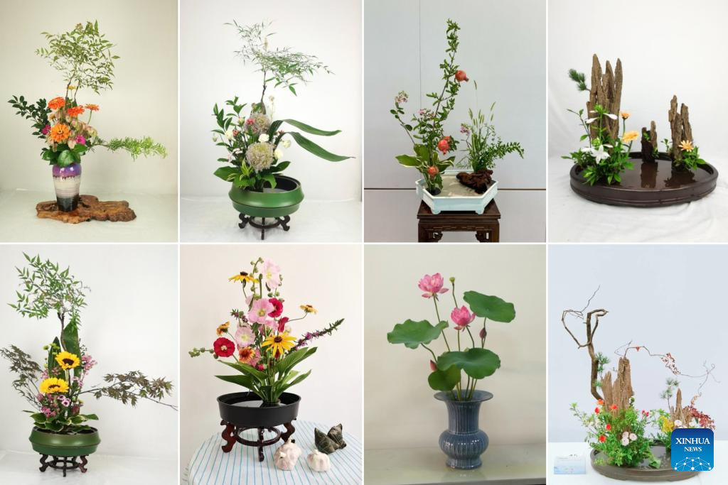 This combo photo provided by Fu Yulan shows her flower arrangement artworks. [Xinhua]