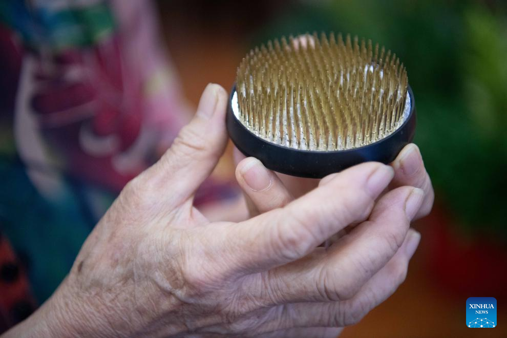 Fu Yulan demonstrates a tool for fixation of flower arrangement at the School of Forestry and Landscape Architecture of the Anhui Agricultural University in Hefei, east China's Anhui Province, Sept. 29, 2025. [Xinhua/Zhang Duan]