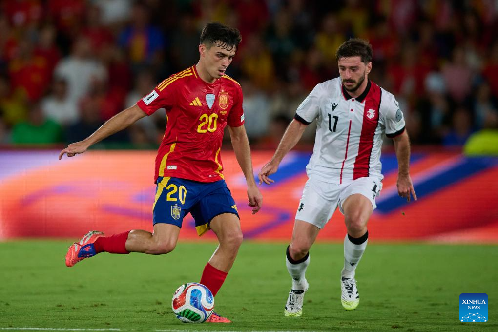 Pedri (L) of Spain vies with Otar Kiteishvili of Georgia during the 2026 FIFA World Cup UEFA Qualifiers football match between Spain and Georgia, at Manuel Martinez Valero Stadium, Elche, Spain, on October 11, 2025. (Photo by Stinger/Xinhua)