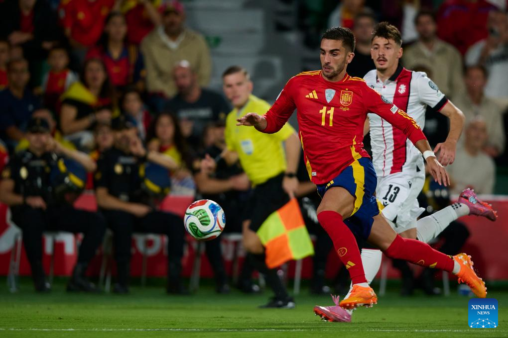 Ferran Torres (front L) of Spain competes during the 2026 FIFA World Cup UEFA Qualifiers football match between Spain and Georgia, at Manuel Martinez Valero Stadium, Elche, Spain, on October 11, 2025. (Photo by Stinger/Xinhua)