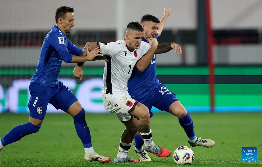 Albania's Rey Manaj (C) vies with Serbia's Nemanja Maksimovic and Milos Veljkovic (R) during the World Cup 2026 European Qualifiers Group K football match between Serbia and Albania in Leskovac, Serbia on Oct. 11, 2025. (Photo by Predrag Milosavljevic/Xinhua)