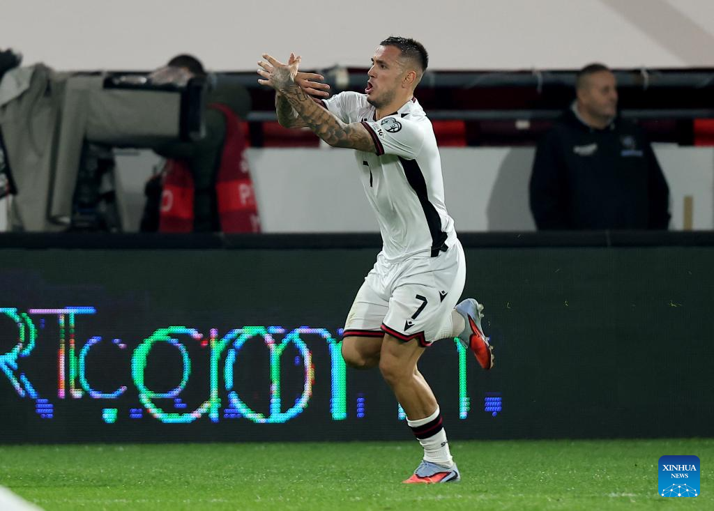 Albania's Rey Manaj celebrates a goal during the World Cup 2026 European Qualifiers Group K football match between Serbia and Albania in Leskovac, Serbia on Oct. 11, 2025. (Photo by Predrag Milosavljevic/Xinhua)