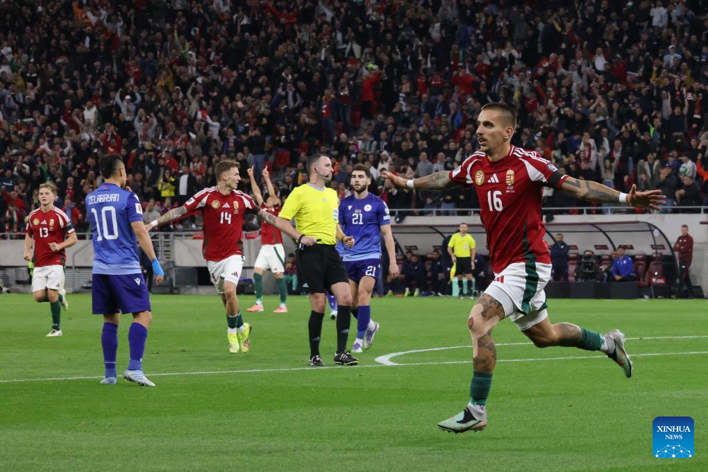 Daniel Lukacs (1st R) of Hungary reacts after scoring during the 2026 FIFA World Cup European Qualifiers football match between Hungary and Armenia in Budapest, Hungary, on Oct. 11, 2025. (Photo by Attila Volgyi/Xinhua)
