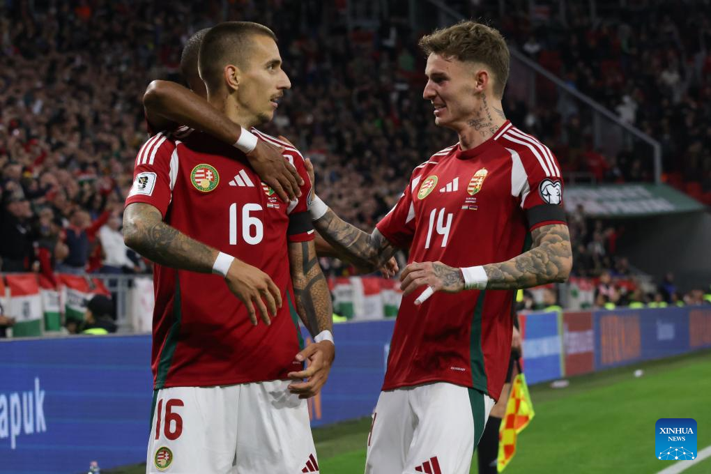 Daniel Lukacs (L) and Bendeguz Bolla of Hungary react to scoring during the 2026 FIFA World Cup European Qualifiers football match between Hungary and Armenia in Budapest, Hungary, on Oct. 11, 2025. (Photo by Attila Volgyi/Xinhua)