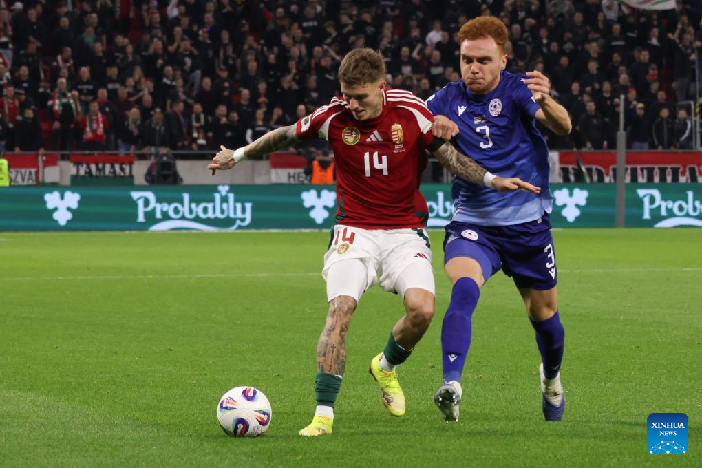 Bendeguz Bolla (L) of Hungary vies with Erik Piloyan of Armenia during the 2026 FIFA World Cup European Qualifiers football match between Hungary and Armenia in Budapest, Hungary, on Oct. 11, 2025. (Photo by Attila Volgyi/Xinhua)