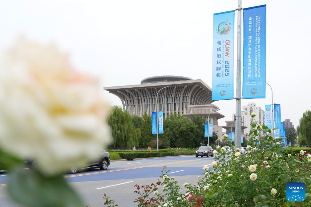 Street banners for the Global Leaders' Meeting on Women are pictured in Beijing, capital of China, on Oct. 12, 2025. The Global Leaders' Meeting on Women will be held in Beijing from Oct. 13 to 14. (Xinhua/Xue Yuge)