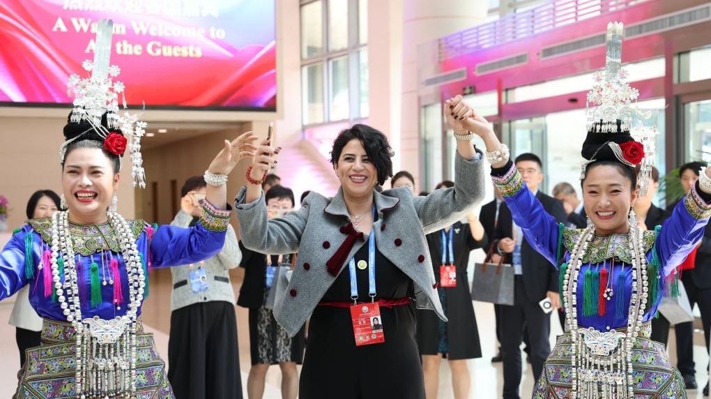 A guest from Algeria dances with performers of Dong ethnic group during an exhibition showcasing China's progress in digital and intelligent empowerment for women and girls, in Beijing, capital of China, Oct. 14, 2025. The exhibition was opened on Tuesday as a side event of the Global Leaders' Meeting on Women. (Xinhua/Liang Xu)