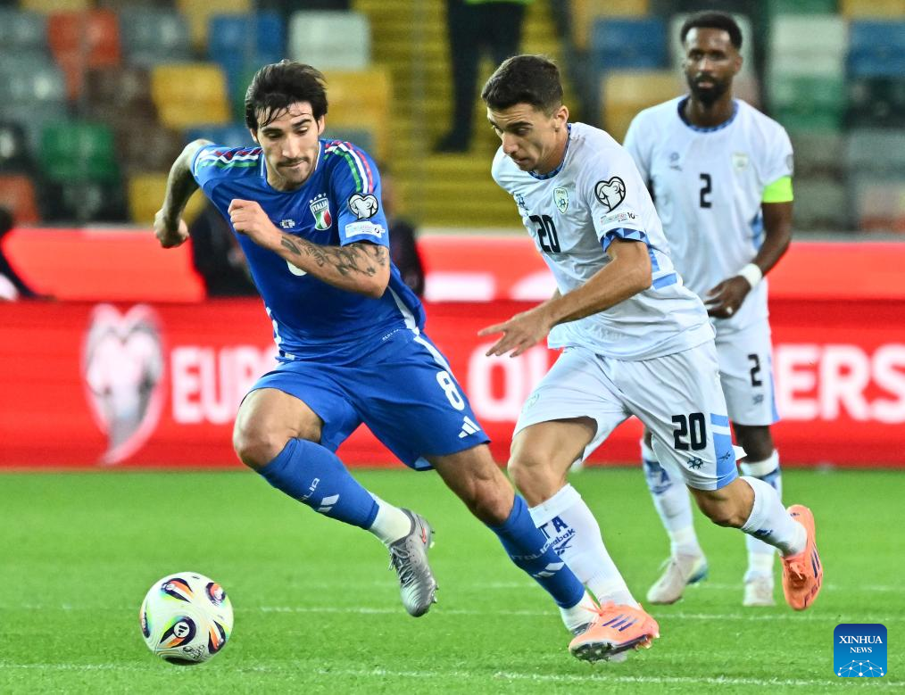 Sandro Tonali (L) of Italy vies for the ball against Dan Biton (R) of Israel during the FIFA World Cup 2026 European Qualifiers Group I match between Italy and Israel in Udine, Italy, Oct. 14, 2025. (Photo by Diego Petrussi/Xinhua)