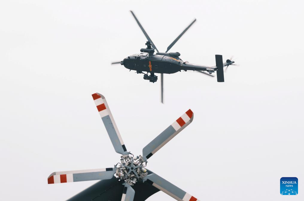 A helicopter of Fenglei aerobatic team of the Chinese People's Liberation Army (PLA) performs during the opening ceremony of the 7th China Helicopter Exposition in north China's Tianjin Municipality, Oct. 16, 2025. Spanning an exhibition area of approximately 160,000 square meters, the exposition kicked off here on Thursday and will last until Oct. 19. (Xinhua/Li Jie)