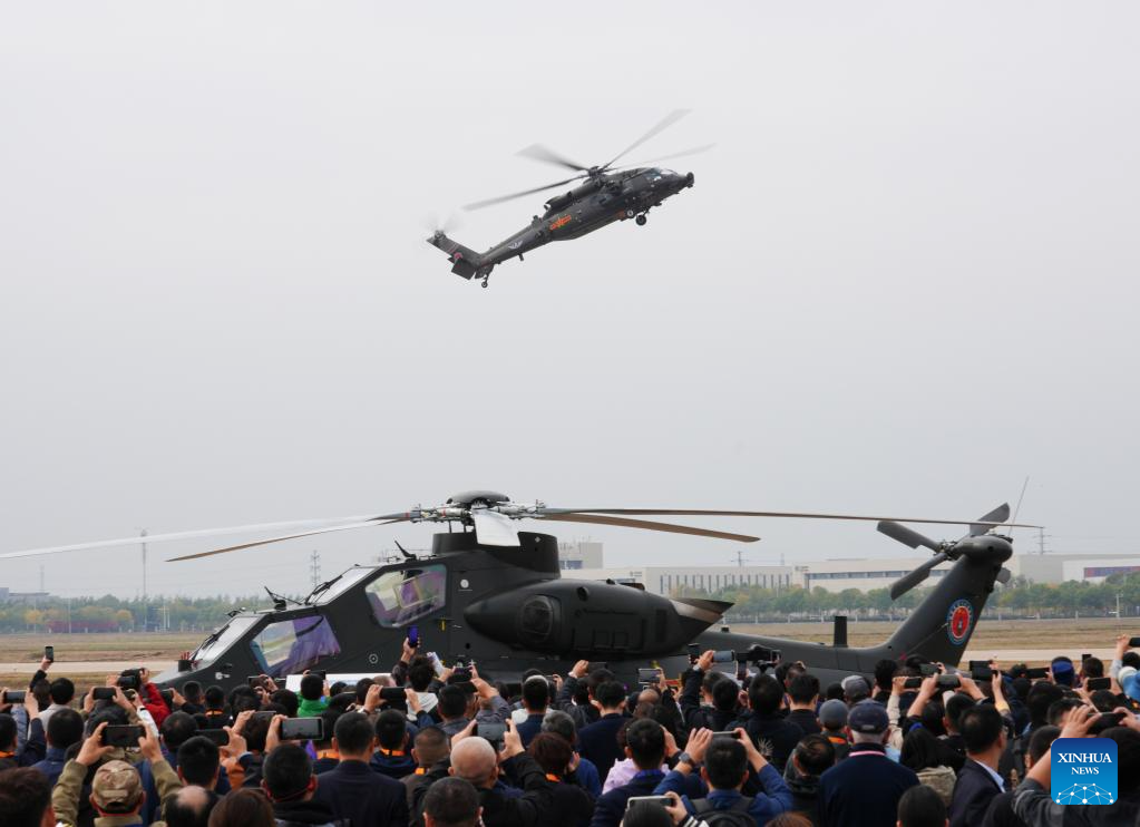 A helicopter of Fenglei aerobatic team of the Chinese People's Liberation Army (PLA) performs during the opening ceremony of the 7th China Helicopter Exposition in north China's Tianjin Municipality, Oct. 16, 2025. Spanning an exhibition area of approximately 160,000 square meters, the exposition kicked off here on Thursday and will last until Oct. 19. (Photo by Luan Cheng/Xinhua)