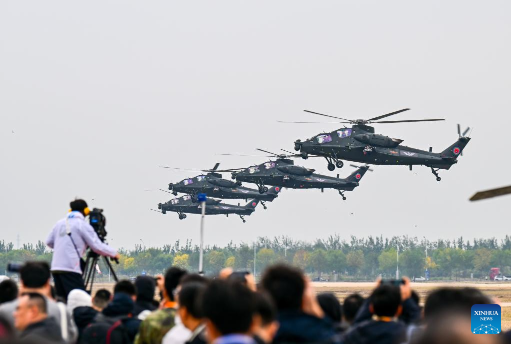 Helicopters of Fenglei aerobatic team of the Chinese People's Liberation Army (PLA) perform during the opening ceremony of the 7th China Helicopter Exposition in north China's Tianjin Municipality, Oct. 16, 2025. Spanning an exhibition area of approximately 160,000 square meters, the exposition kicked off here on Thursday and will last until Oct. 19. (Xinhua/Sun Fanyue)