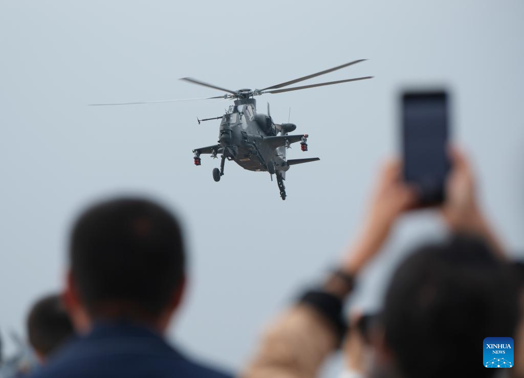 A helicopter of Fenglei aerobatic team of the Chinese People's Liberation Army (PLA) performs during the opening ceremony of the 7th China Helicopter Exposition in north China's Tianjin Municipality, Oct. 16, 2025. Spanning an exhibition area of approximately 160,000 square meters, the exposition kicked off here on Thursday and will last until Oct. 19. (Xinhua/Li Jie)