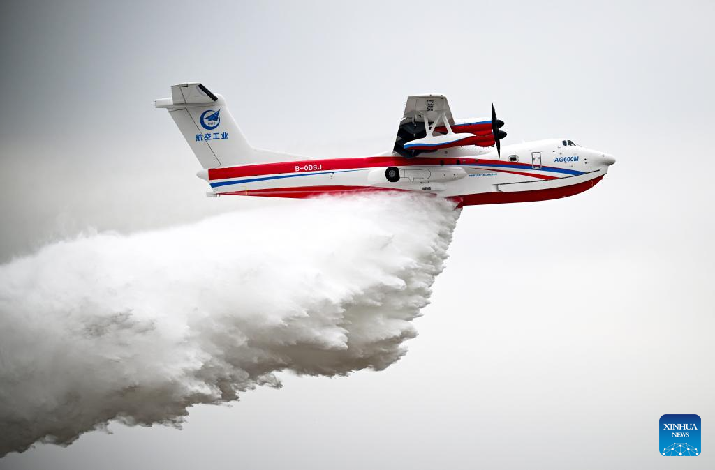 An AG600 amphibious aircraft performs during the 7th China Helicopter Exposition in Tianjin, north China, Oct. 16, 2025. Spanning an exhibition area of approximately 160,000 square meters, the exposition kicked off here on Thursday and will last until Oct. 19. (Xinhua/Zhao Zishuo)