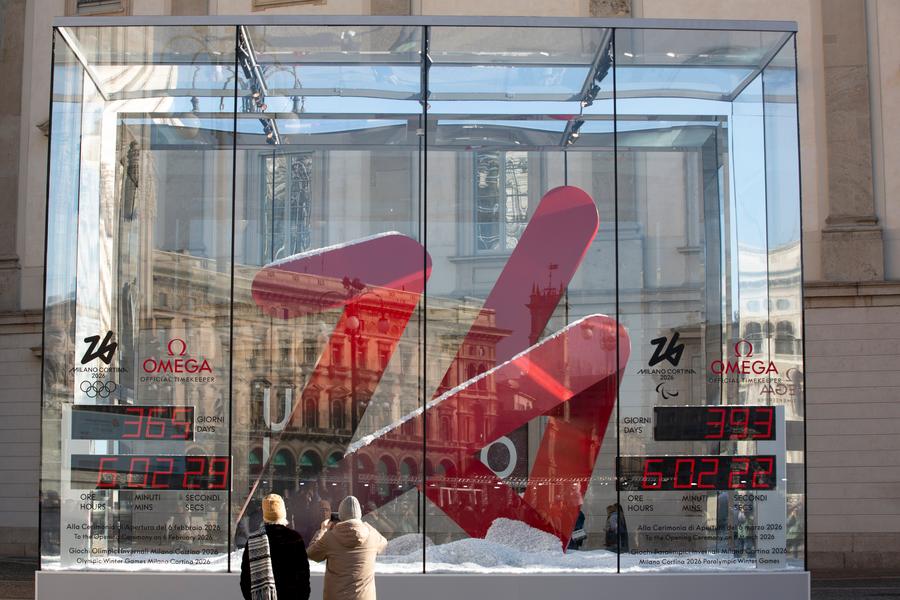 People take photos of the one-year countdown board for the Milan-Cortina 2026 Winter Olympics and Paralympics nearby the Duomo di Milano in Milan, Italy, Feb. 6, 2025. (Xinhua/Li Jing)