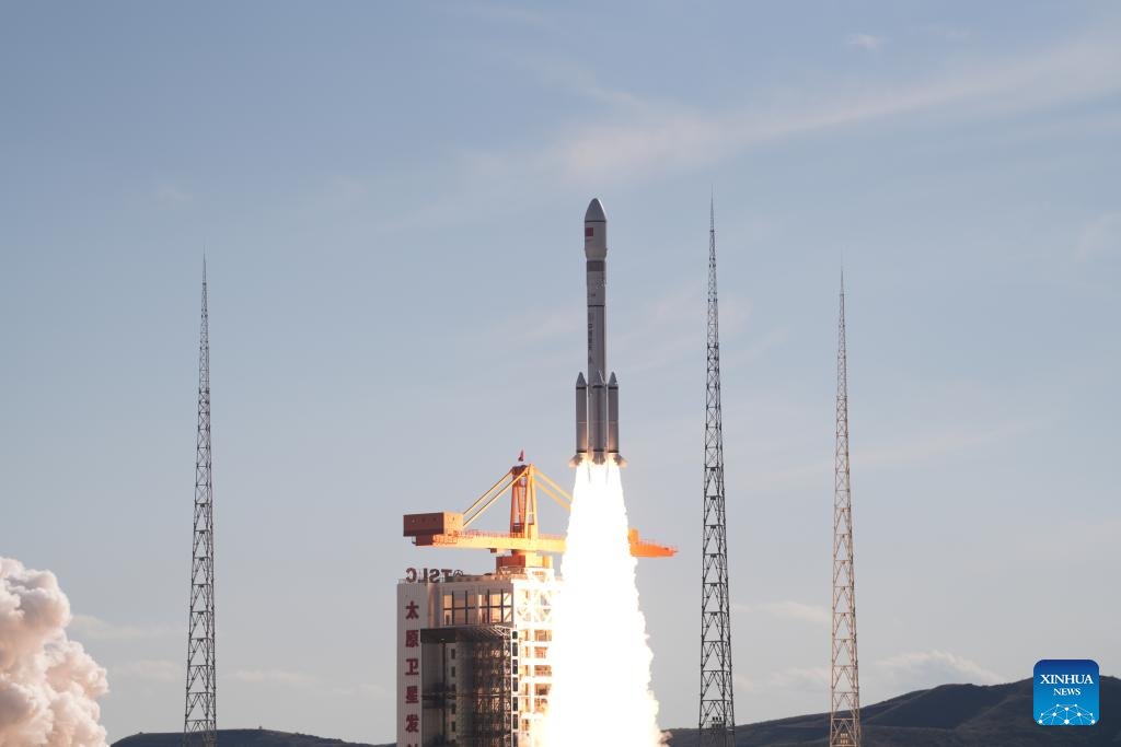 A modified Long March-6 carrier rocket carrying a new satellite group blasts off from the Taiyuan Satellite Launch Center in north China's Shanxi Province on Oct. 17, 2025. The satellite group, which will constitute the Spacesail Constellation -- a commercial Chinese low-orbit satellite network, was launched at 3:08 p.m. (Beijing Time) and entered its preset orbit successfully. [Photo/Xinhua]