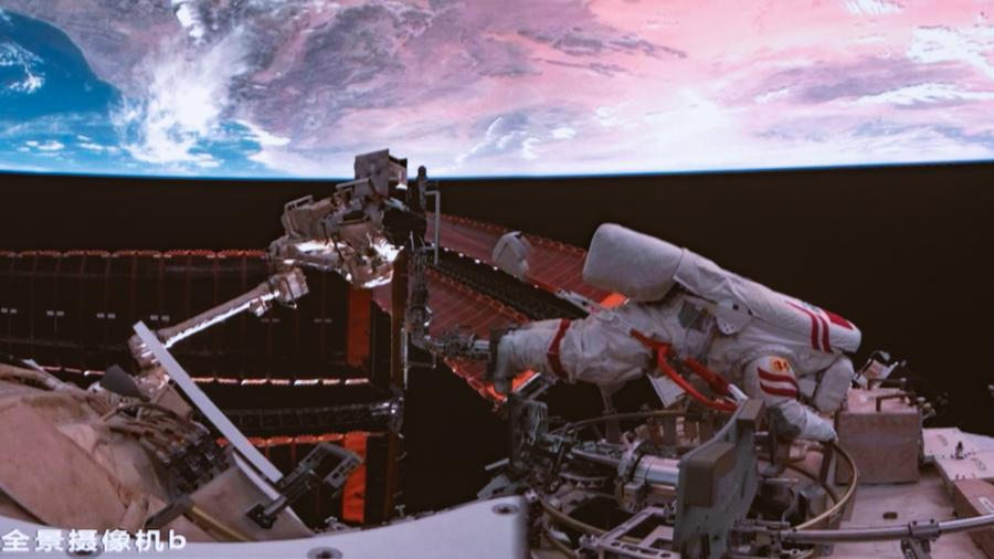This screen image captured at Beijing Aerospace Control Center on Sept. 25, 2025 shows Shenzhou-20 astronaut Wang Jie performing extravehicular activities outside China's orbiting space station. [Photo/Xinhua]