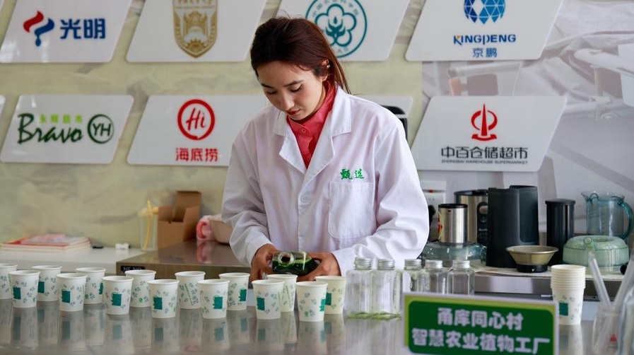 A staff member prepares vegetable juice for visitors at a factory-styled smart farm in Kuqa City, Aksu Prefecture, northwest China's Xinjiang Uygur Autonomous Region, Aug. 13, 2025. The factory-styled smart farm in Kuqa City stands as a flagship project of paired assistance program financed by Ningbo City in east China's Zhejiang Province. [Photo/Xinhua]
