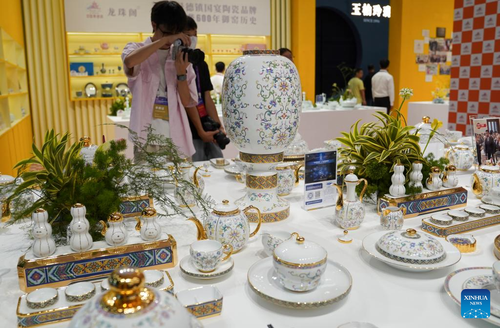 This photo taken on Oct. 18, 2025 shows the ceramic dinnerwares exhibited during the 2025 China Jingdezhen International Ceramic Expo in Jingdezhen, east China's Jiangxi province. The 2025 China Jingdezhen International Ceramic Expo opened on Saturday in Jingdezhen, an eastern Chinese city famed as the "porcelain capital," attracting more than 1,000 buyers from home and abroad. (Xinhua/Zhou Mi)