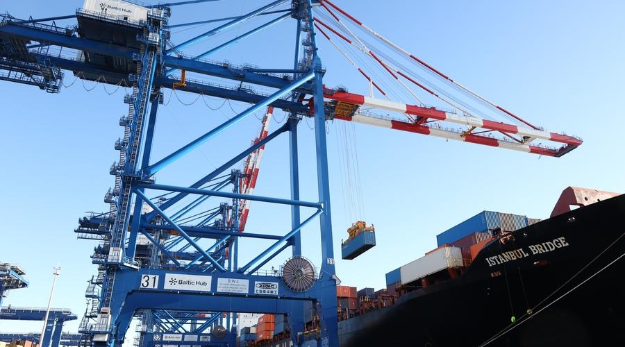 The vessel began berthing at the Baltic Hub Terminal before 6 a.m., slightly delayed due to sea conditions, and loading and unloading operations commenced around 7 a.m., according to port authorities.