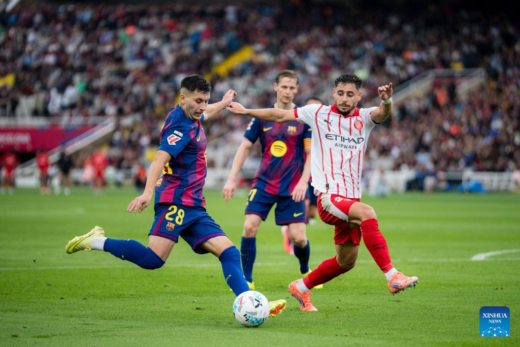 Roony Bardghji (L) of Barcelona vies with Alex Moreno of Girona during the La Liga football match between Barcelona and Girona in Barcelona, Spain, Oct. 18, 2025. (Photo by Joan Gosa/Xinhua)