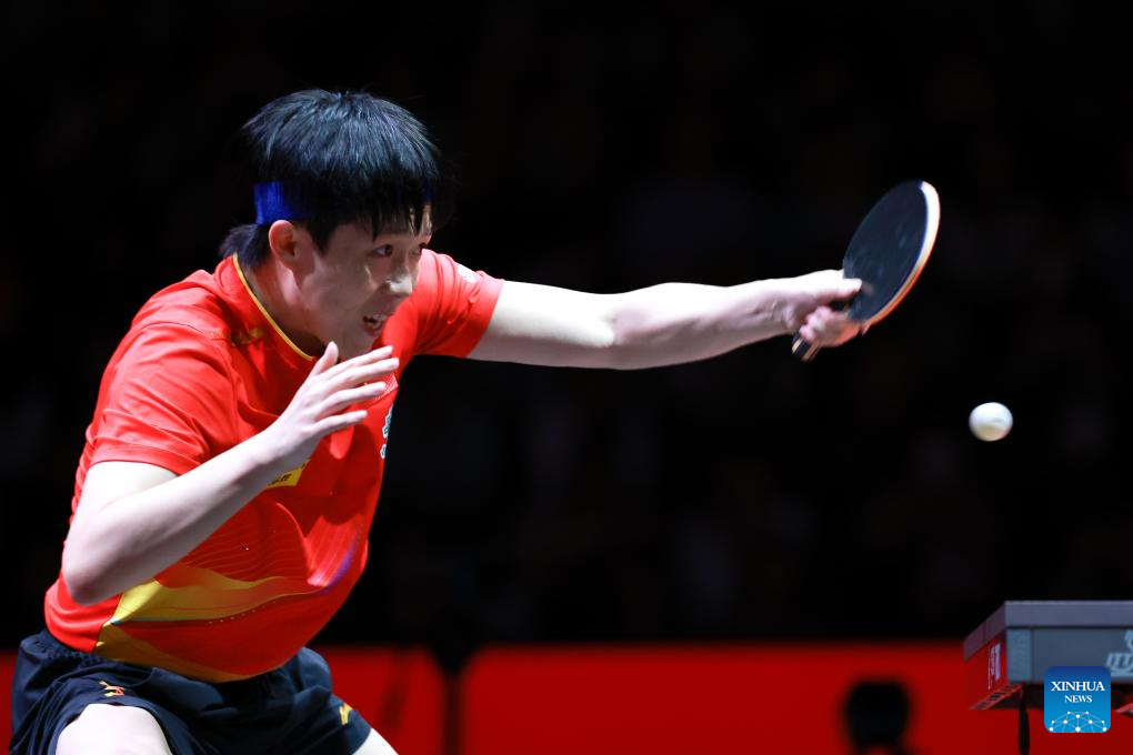 Wang Chuqin hits a return during the men's singles round of 32 match between Wang Chuqin of China and Wong Chun Ting of China's Hong Kong at ITTF World Table Tennis Championships Finals Doha 2025 in Doha, Qatar, May 20, 2025. (Xinhua/Liu Xu)