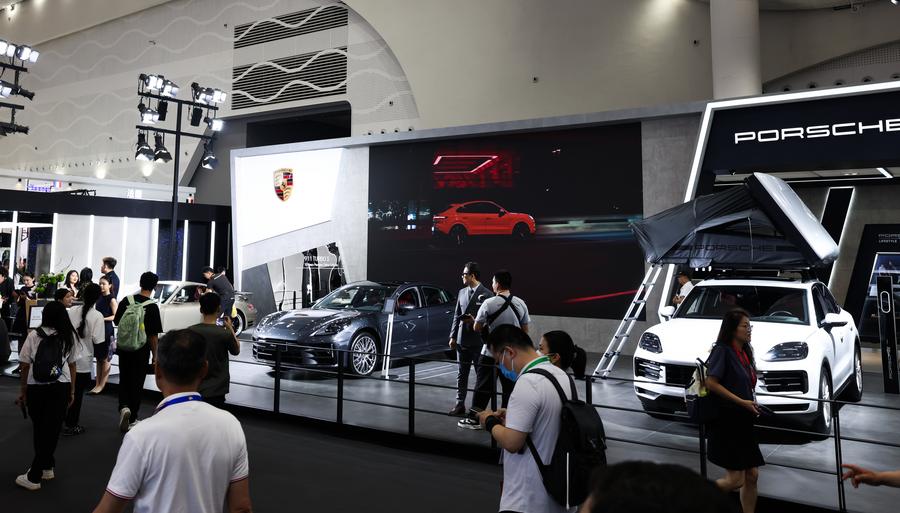 This photo taken on April 14, 2024 shows Porsche cars displayed at the fourth China International Consumer Products Expo (CICPE) in Haikou, capital city of south China's Hainan Province. [Photo/Xinhua]